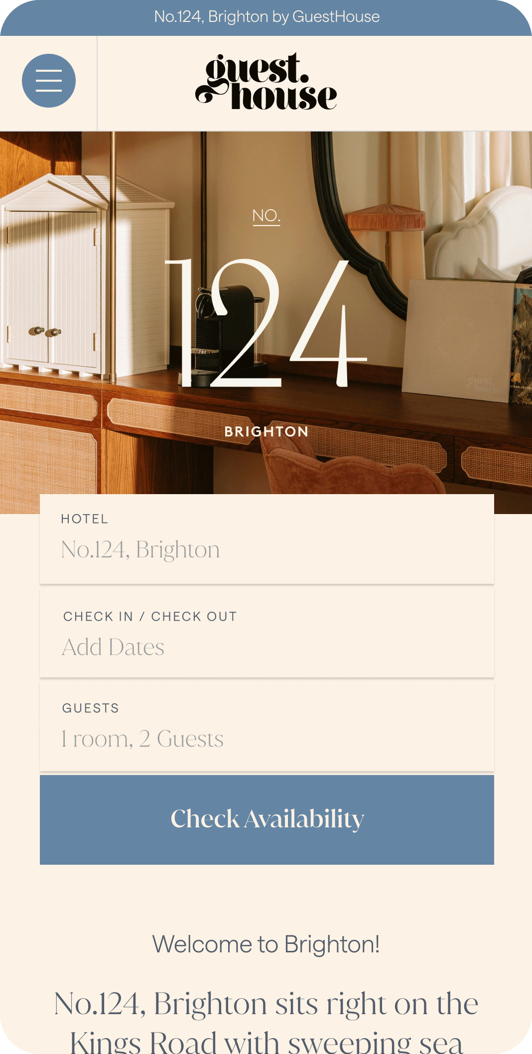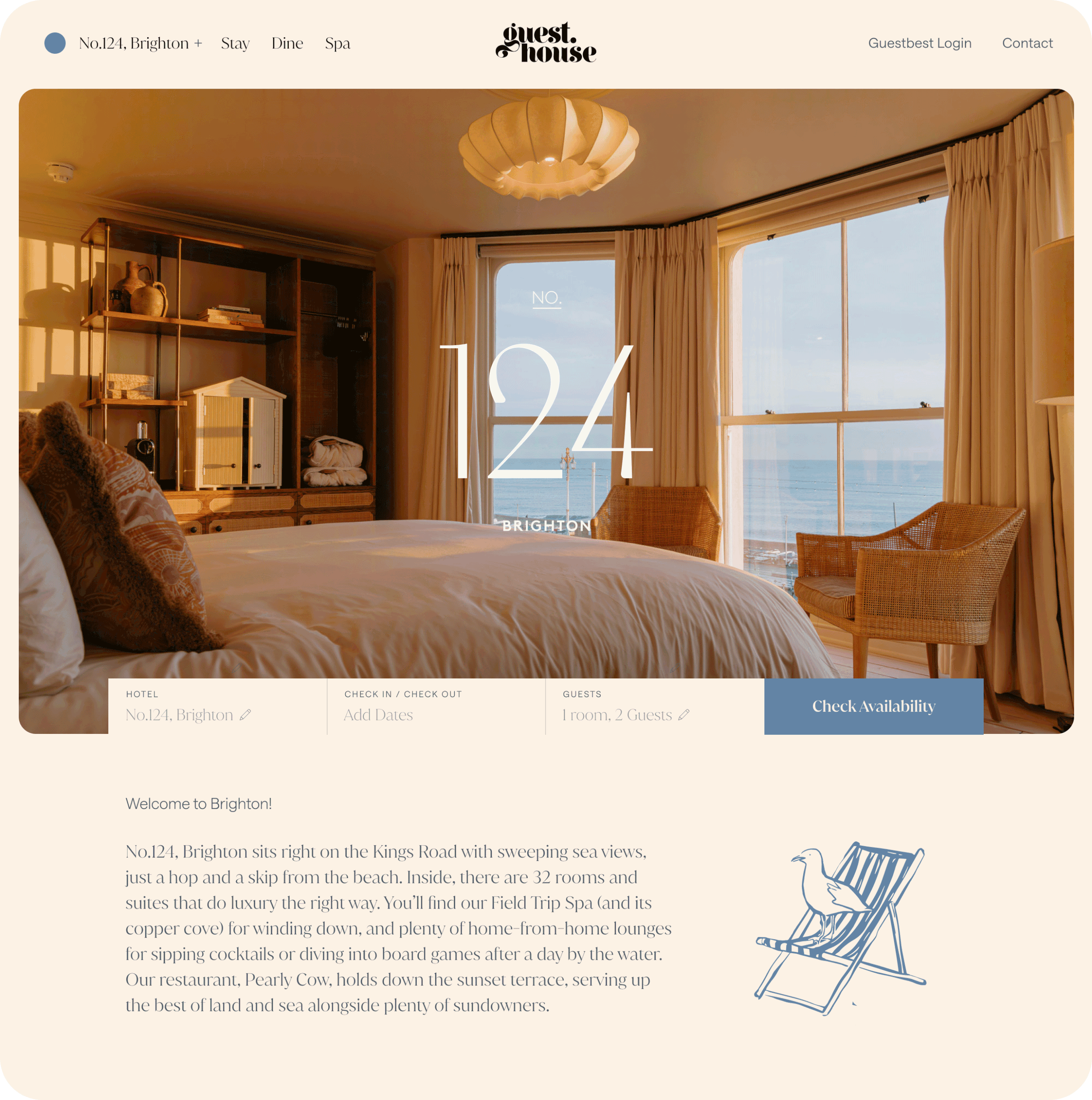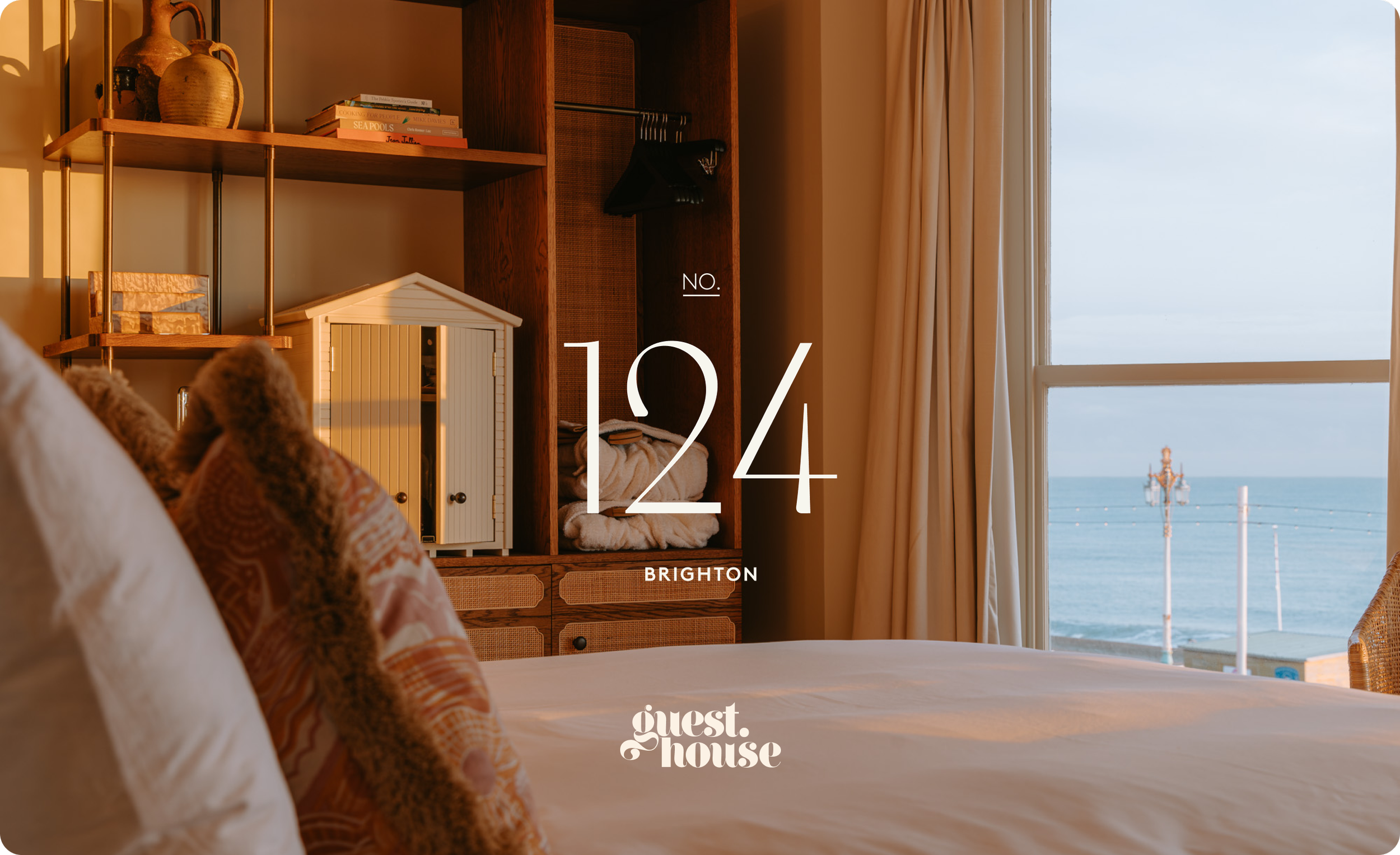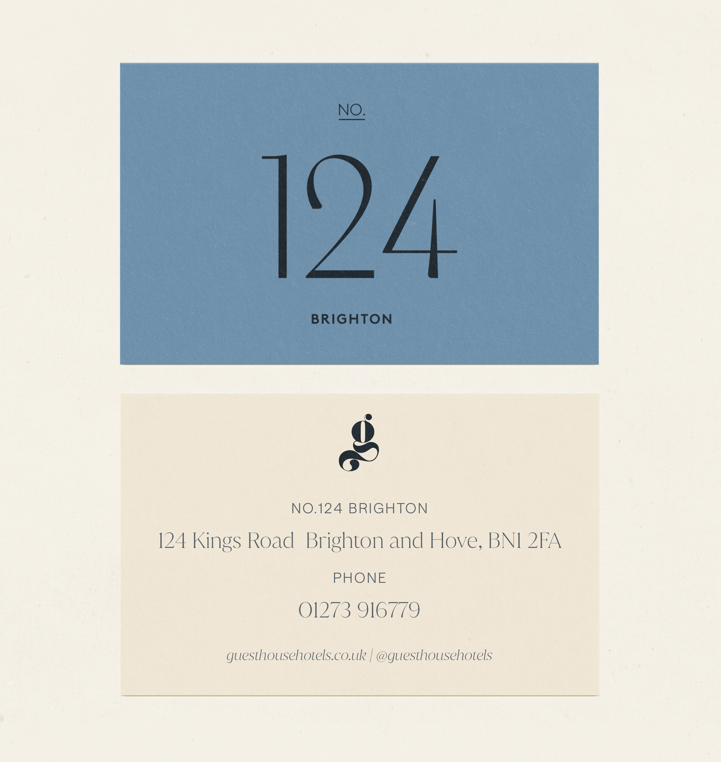 Beyond extending the overarching group identity, I crafted a bespoke logo for No.124, drawing directly from the hotel’s interior aesthetics to convey understated elegance and simplicity. I also refined the brand guidelines, introducing a tailored colour palette and typography system designed specifically for the property. The muted blues echo Brighton’s seaside charm while harmonising seamlessly with the existing GuestHouse palette, reinforcing a cohesive yet distinctive brand presence.