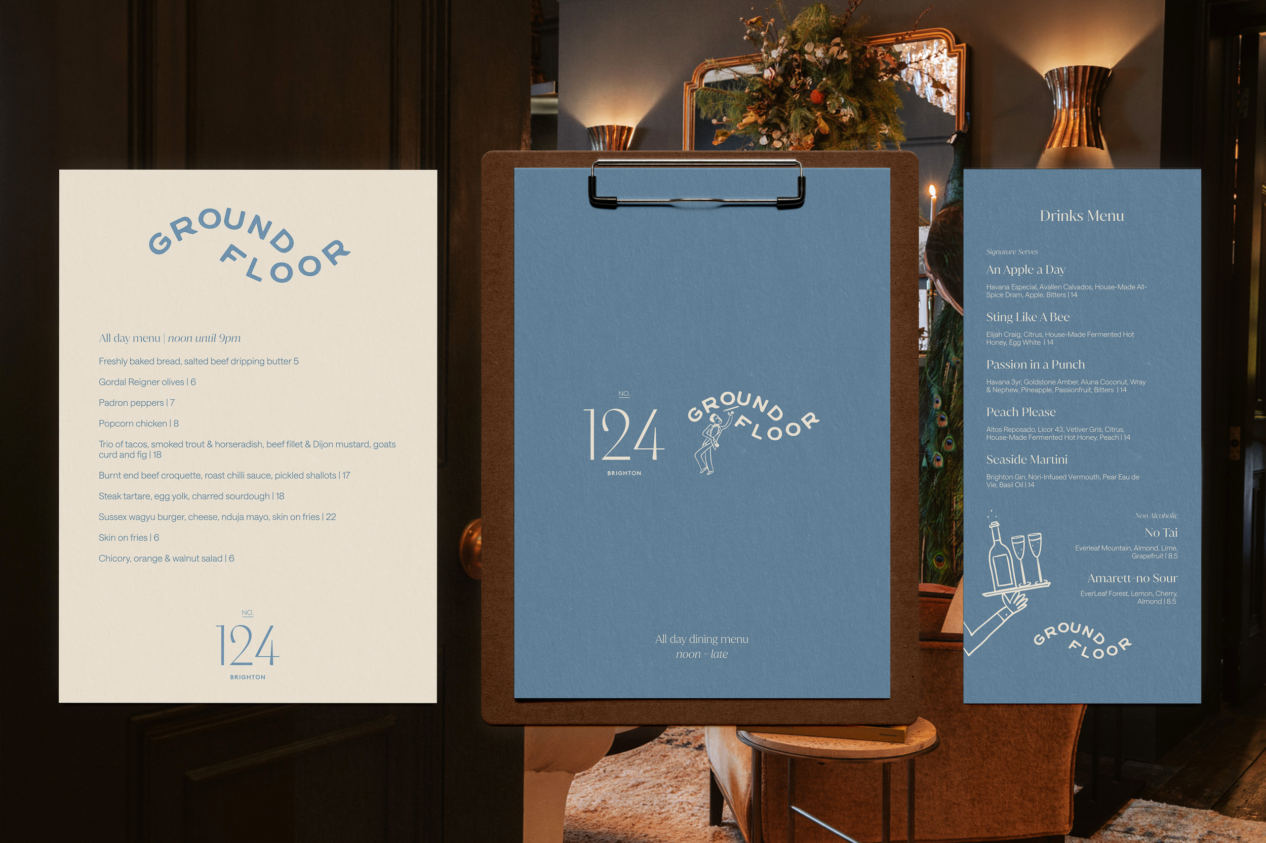 Branding and design for the Ground Floor eatery at No.124; a casual, all-day dining spot at the heart of the No.124.